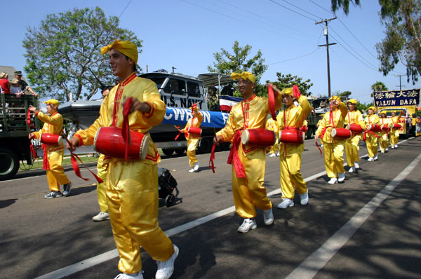 法轮功学员参加圣地亚哥美国独立日的游行,图为学员们的腰鼓队2006-7-4