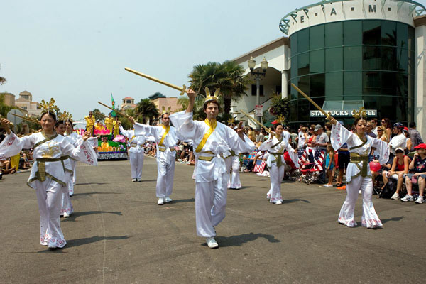 法轮功学员参加加州杭亭顿海美国独立日游行图为学员仙女舞受到观众欢迎2007-7-4