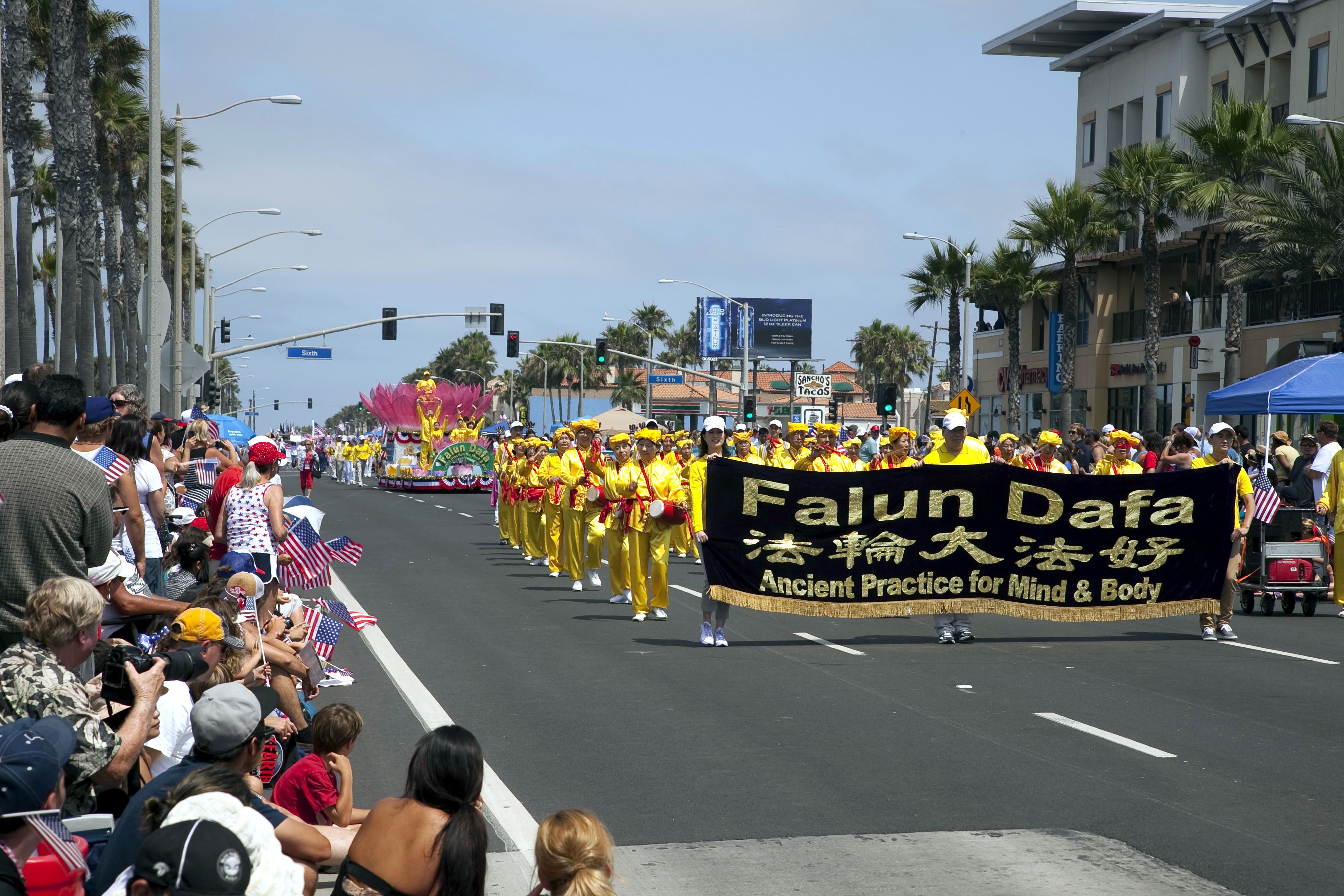 加州圣地亚哥法轮功学员参加海边市独立日游行 所经之处受到观众掌声欢迎