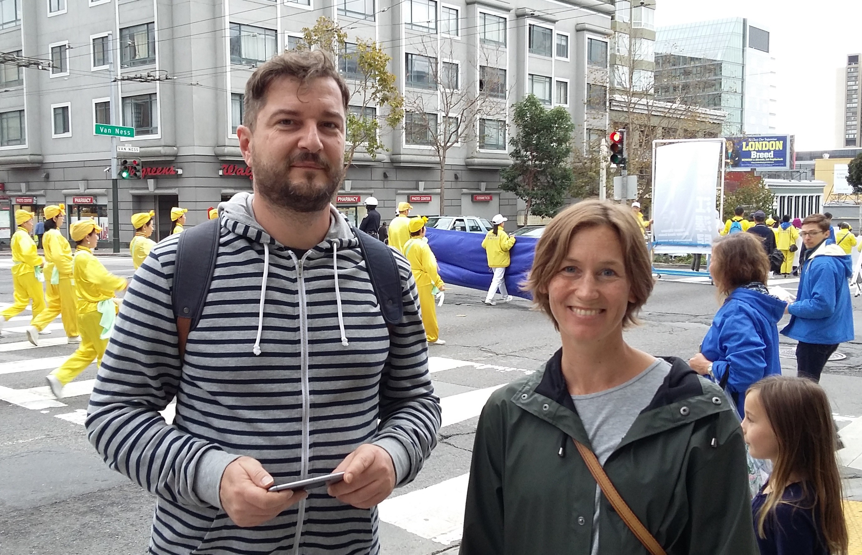 旧金山居民Cisser Damaro(右)说法轮功的队伍很专业