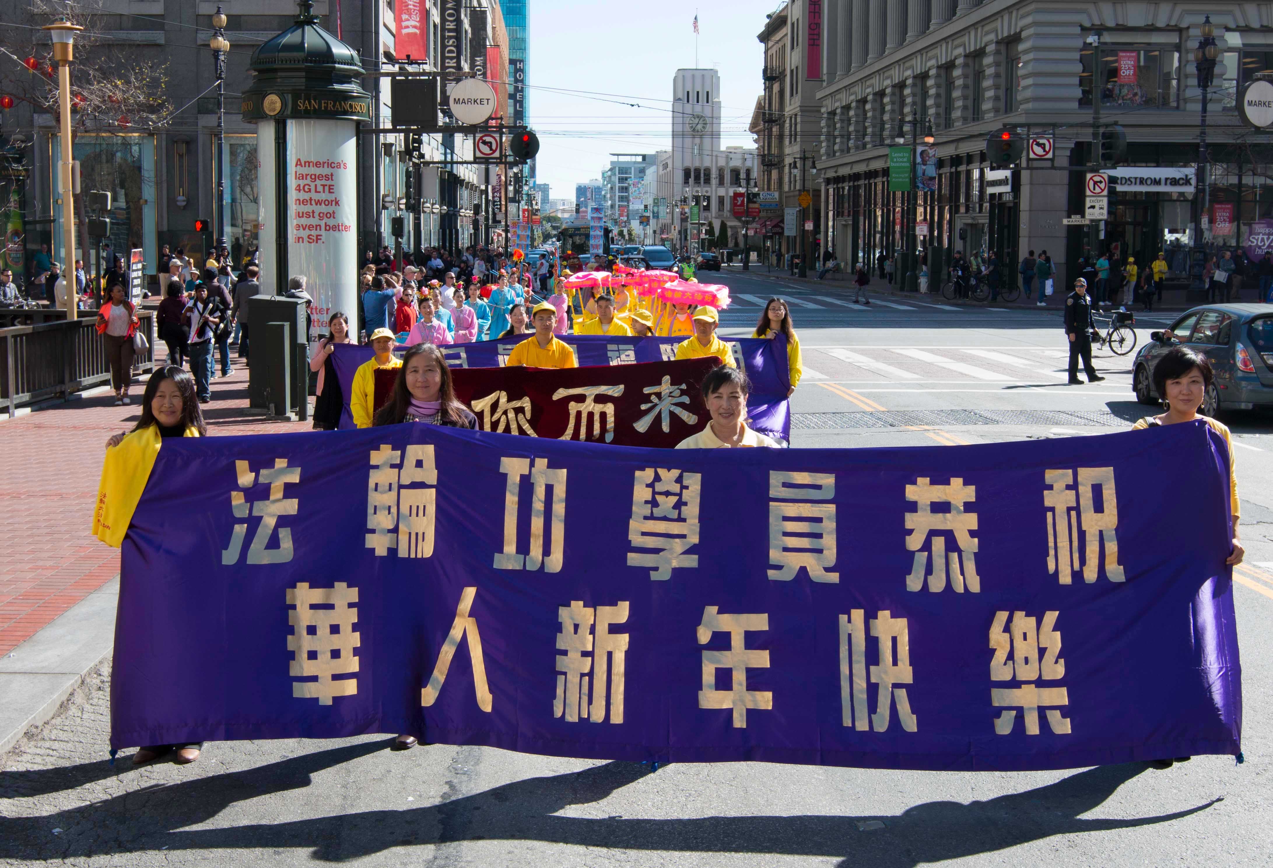 法轮功学员冲破阻挠参加了在旧金山的庆祝中国新年大游行