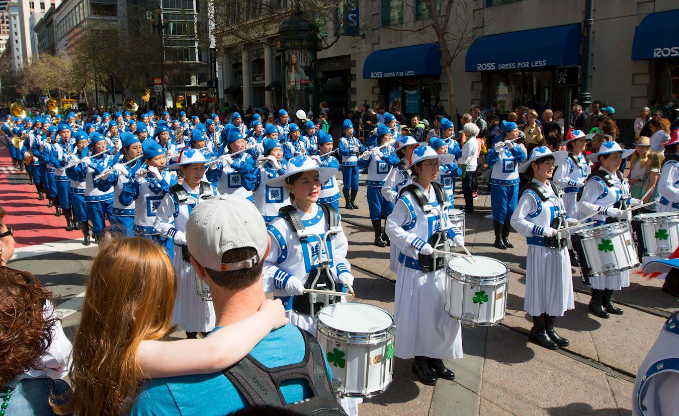 法轮功团体参加旧金山圣派翠克日游行,最受观众欢迎的队伍。