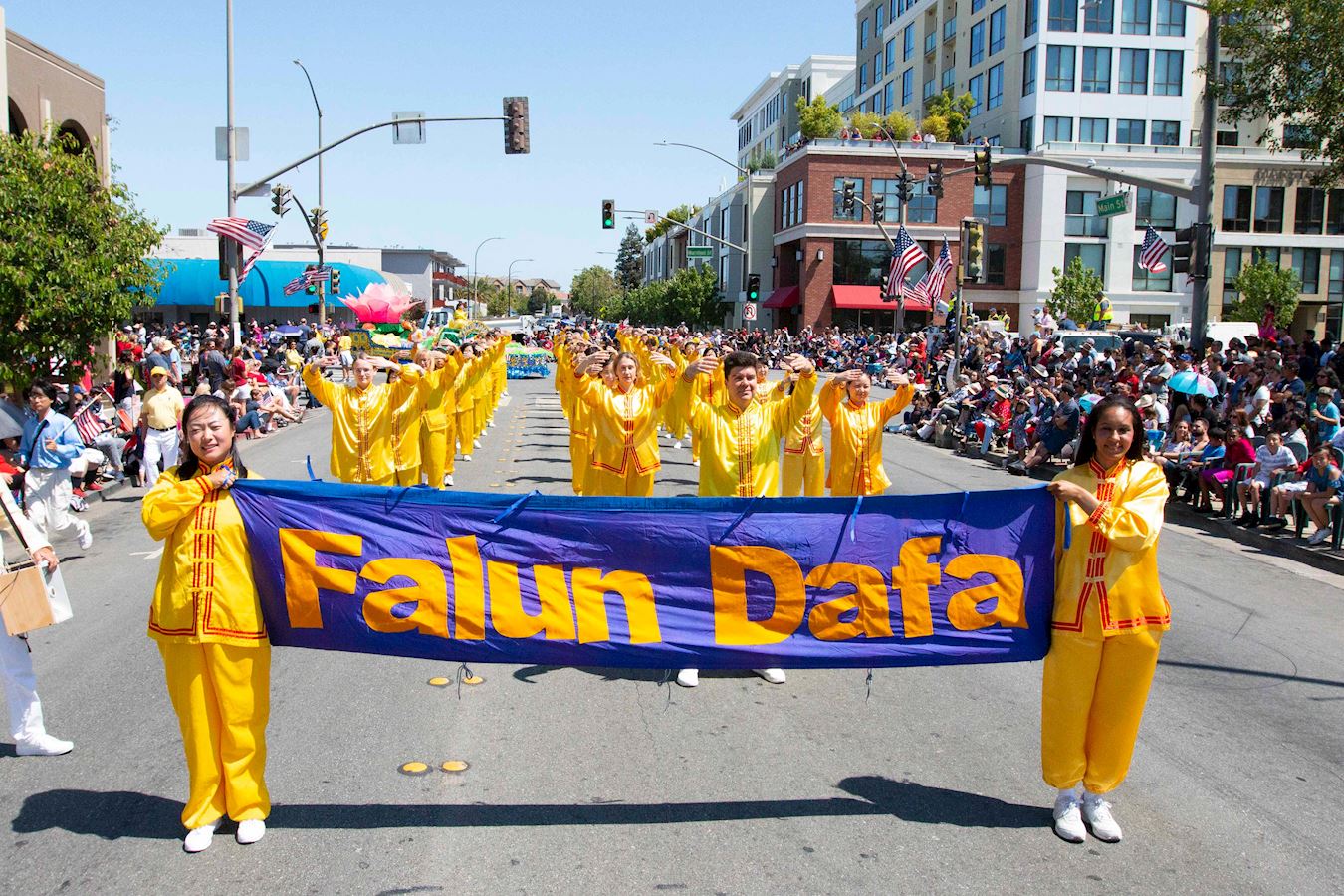 法轮功学员参加北加州独立日游行,气势磅礴的方阵,主办方感激法轮功参加