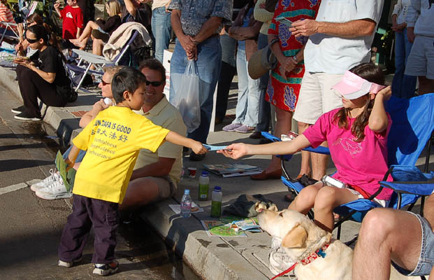 法轮功学员应邀参加圣地亚哥La Jolla的圣诞游行图为小弟子将大法的美好传给有缘人2006-12-3