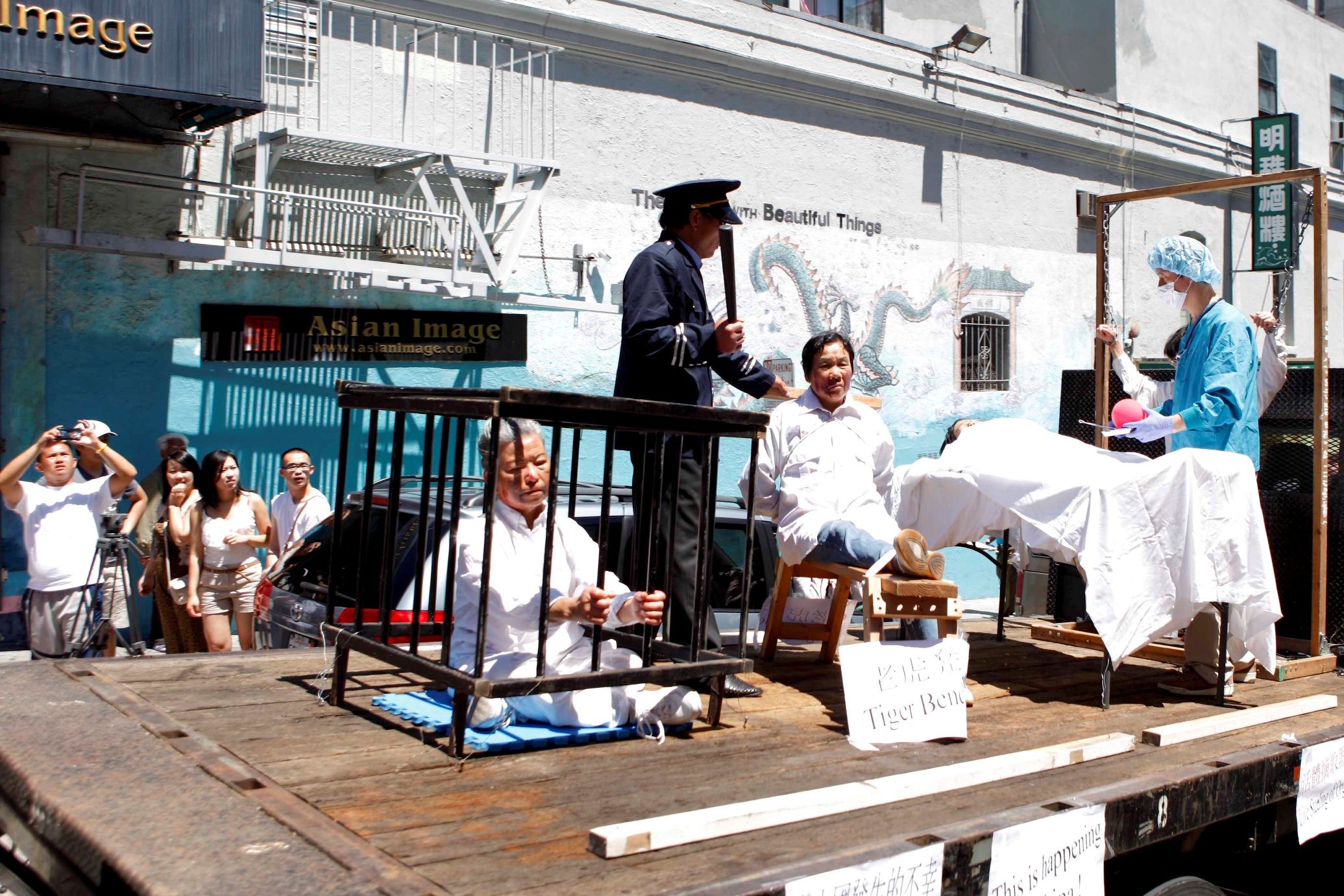 世界各国学员举行旧金山正法之路大游行 图为游行中真人酷刑演示