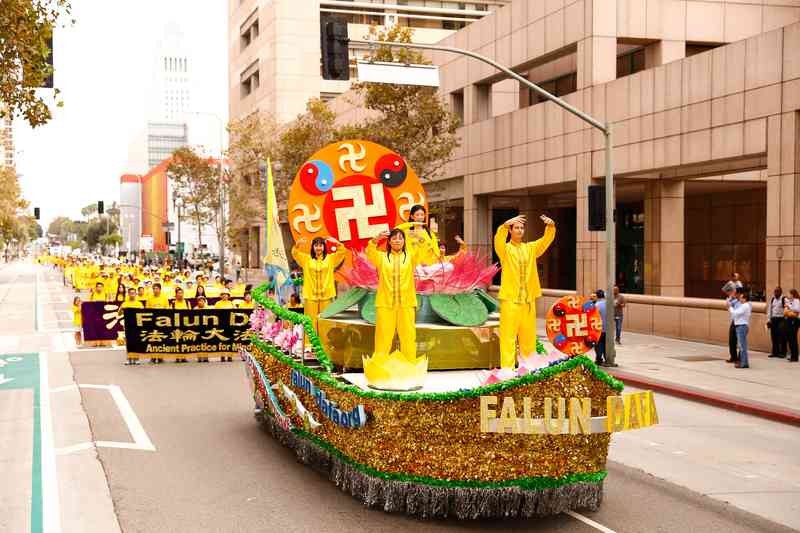 法轮功的游行队伍成为美西最大国庆游行中的唯一华人队伍 图为法轮功队伍的花车