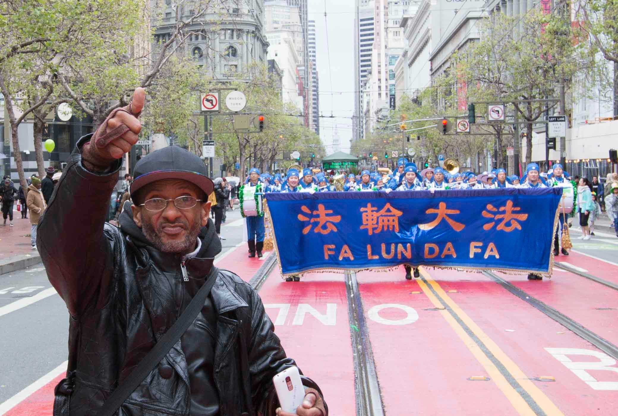 法轮功团体参加旧金山圣派翠克日游行,最受观众欢迎的队伍。