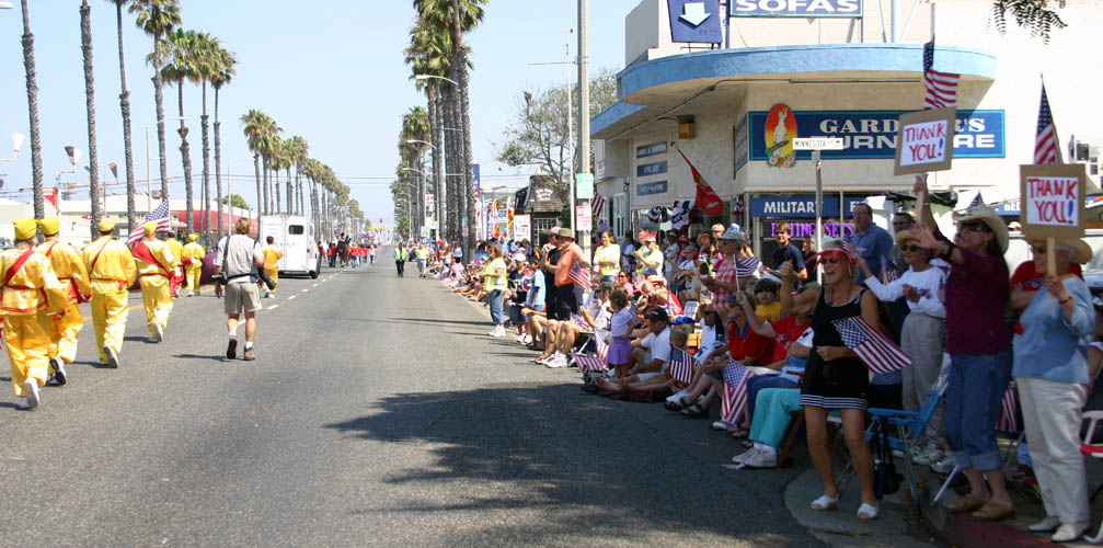 加州圣地亚哥法轮功学员参加海边市独立日游行 所经之处受到观众掌声欢迎