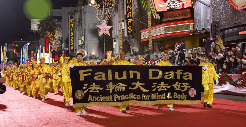 法轮功学员参加好莱坞圣诞大游行,沿途观众报以阵阵欢呼