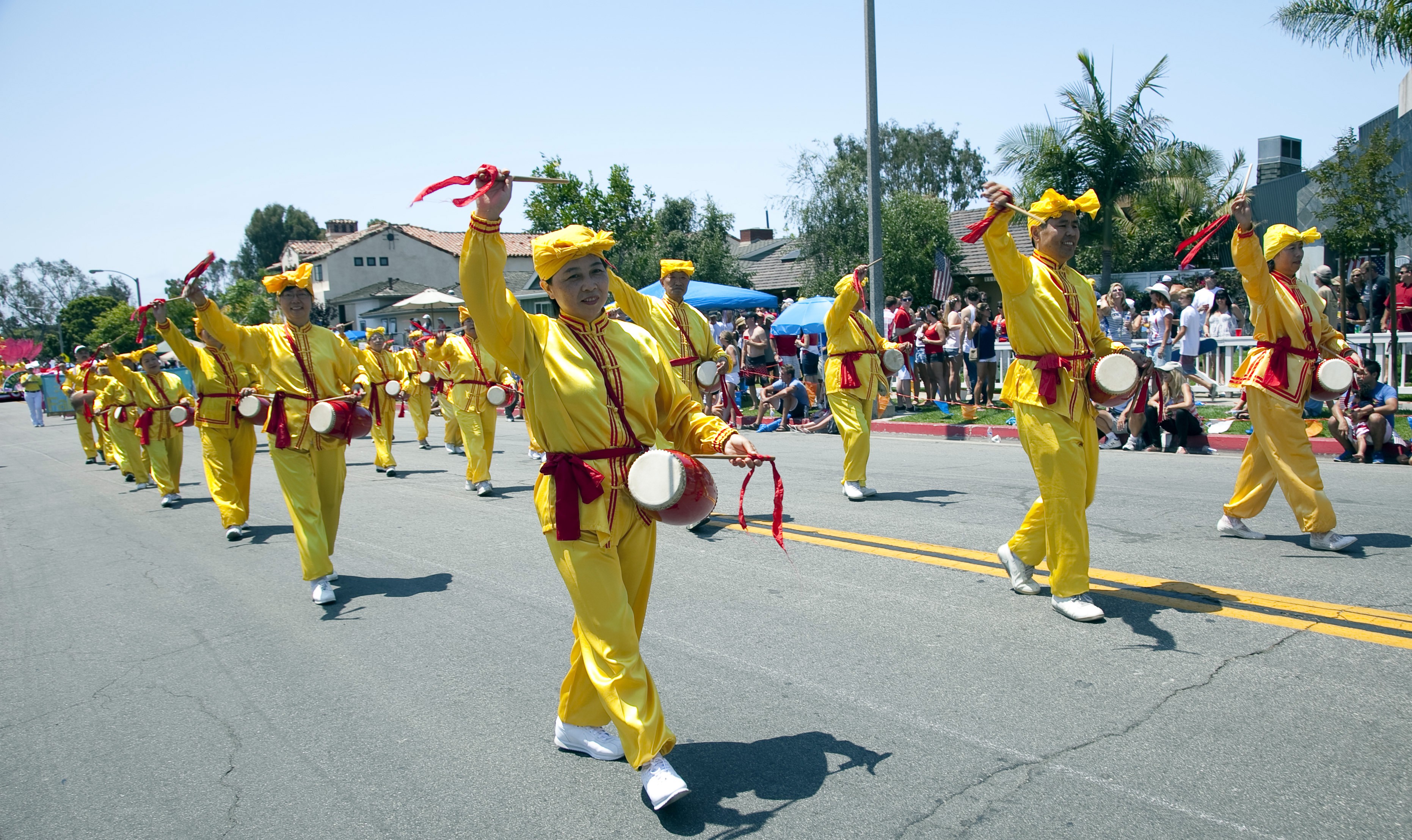 法轮功学员队伍参加杭庭顿海滩市国庆游行,祥和的炼功音乐和优美的功法表演,让人瞩目。