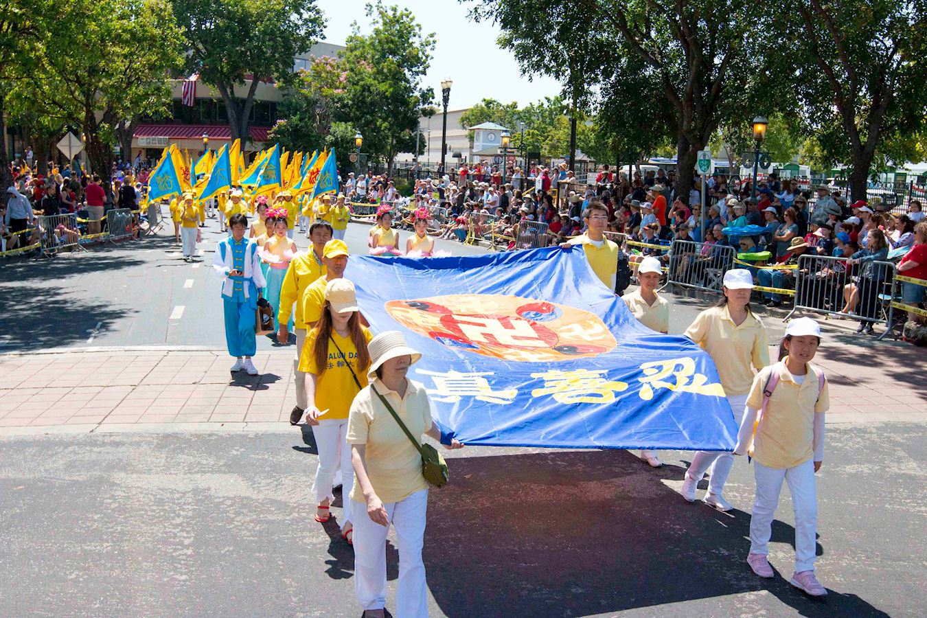 法轮功学员参加北加州独立日游行,气势磅礴的方阵,主办方感激法轮功参加