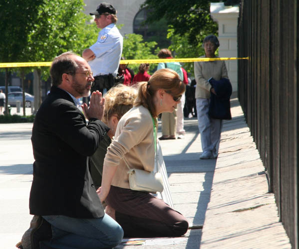 基督教捍卫联盟的三名成员在白宫前跪下祈祷,声援在白宫喊话的王文怡博士,呼吁制止中共迫害法轮功 2006-5-2
