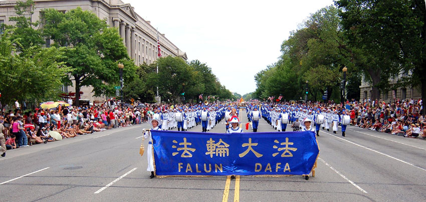 法轮功学员参加美国首都华盛顿的独立日游行,赢得观众的热情喝彩