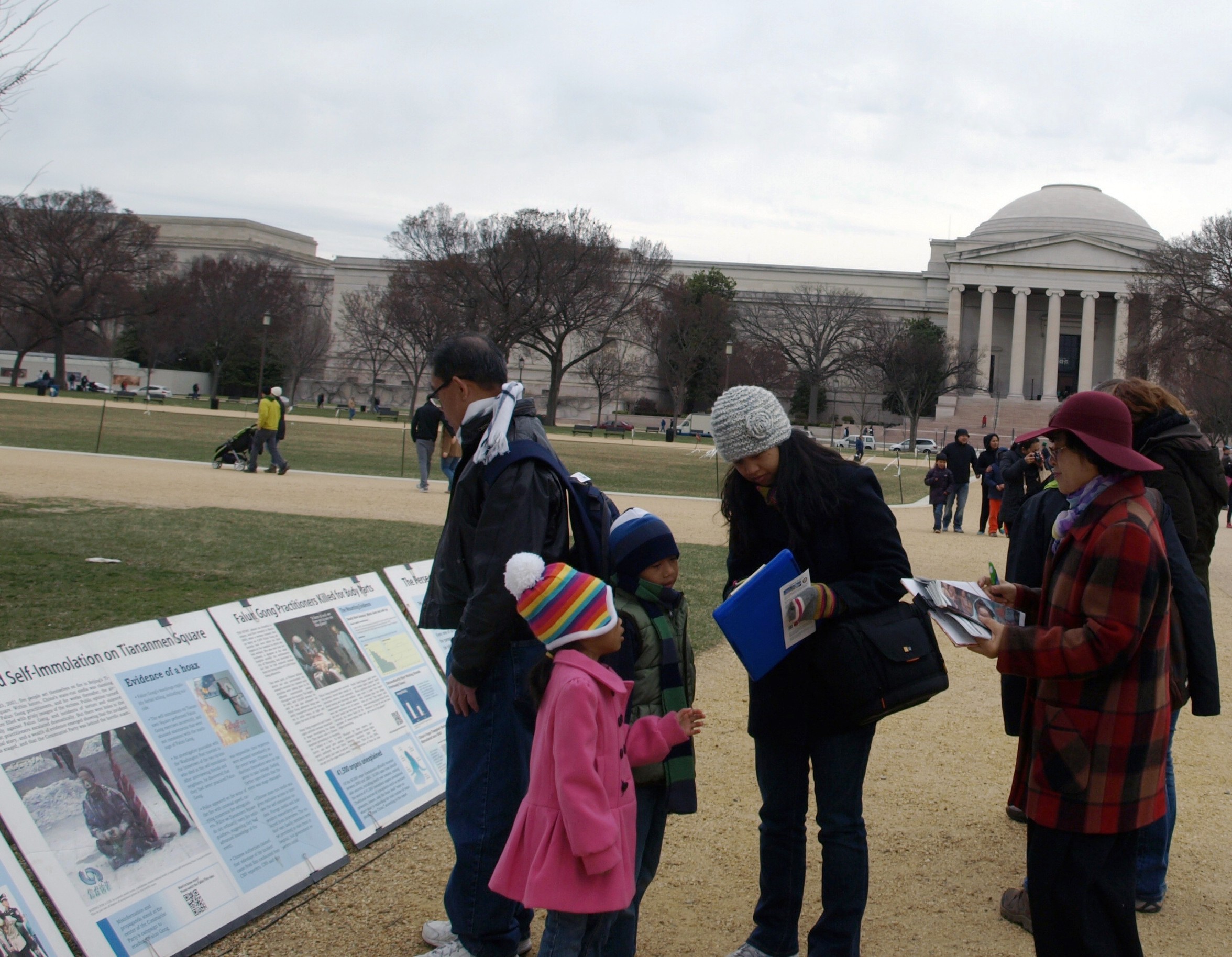 华盛顿DC法轮功学员在在宇航馆马路的对面设立的真相点,向来自世界各地的游客传播法轮功的真相
