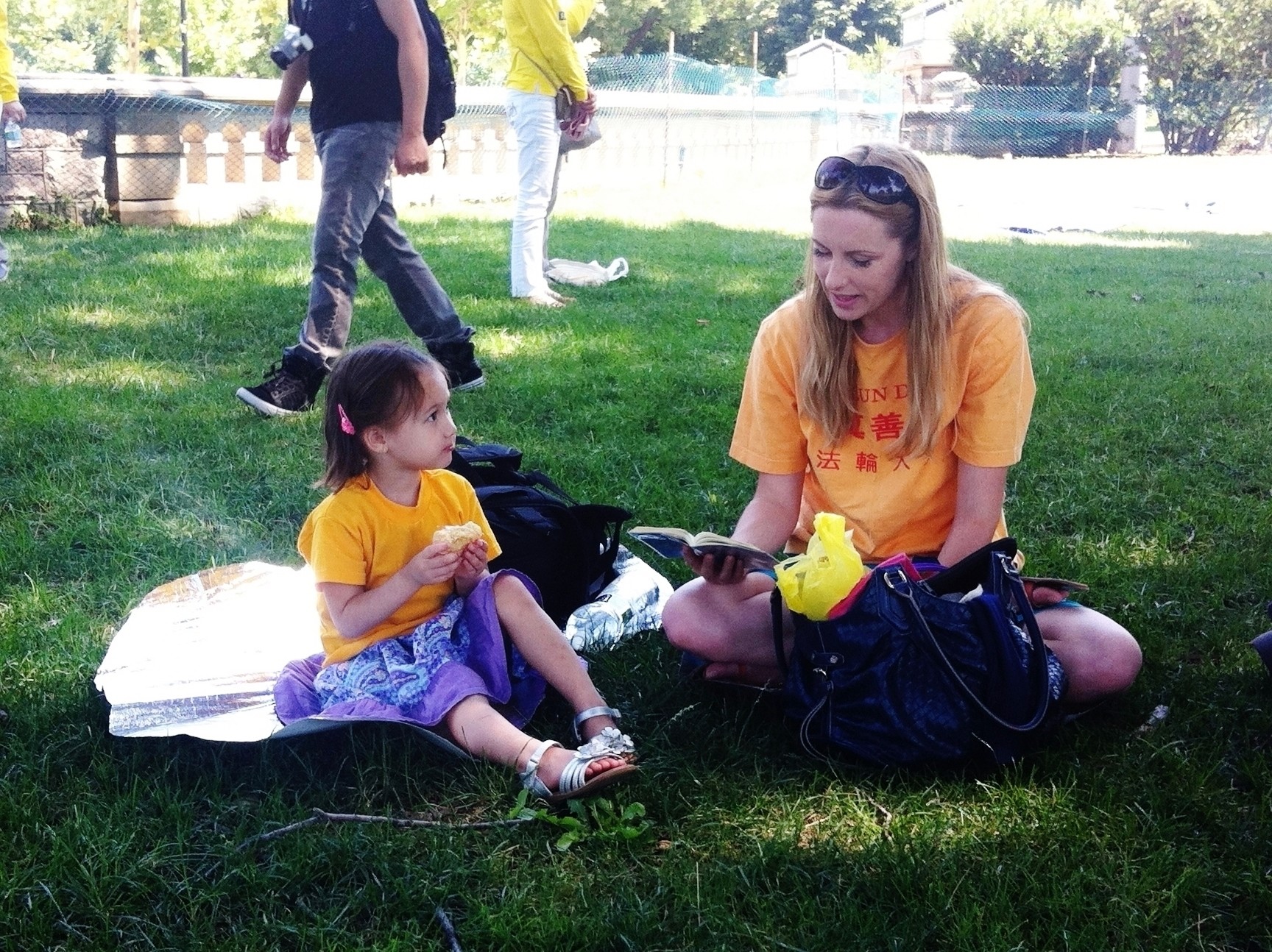 美国首都华盛顿举办了"解体中共 停止迫害法轮功"大型游行集会,母子俩为声援法轮功,特意来观看游行。