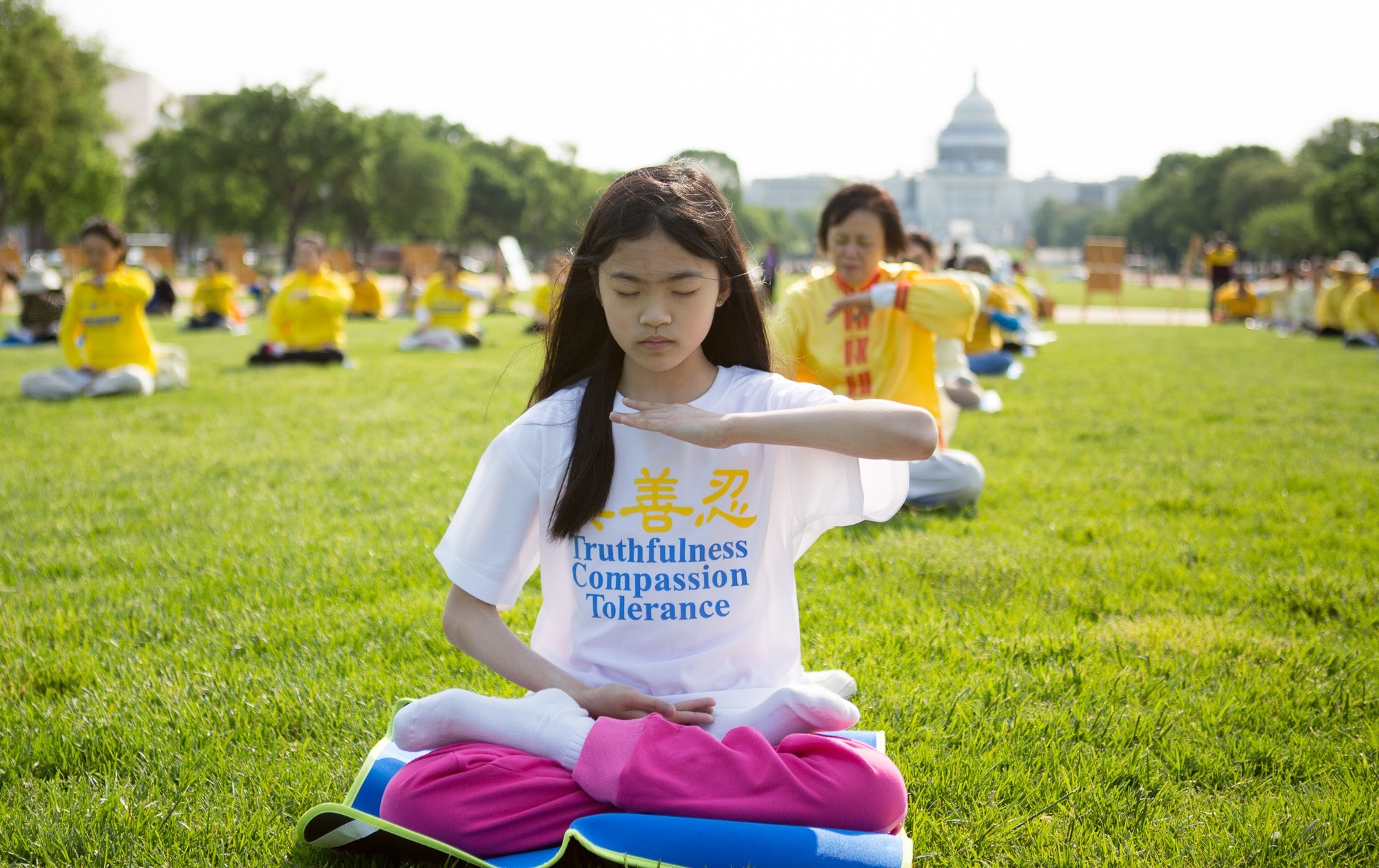 华府学员庆祝世界法轮大法日,在国家广场草坪上集体炼