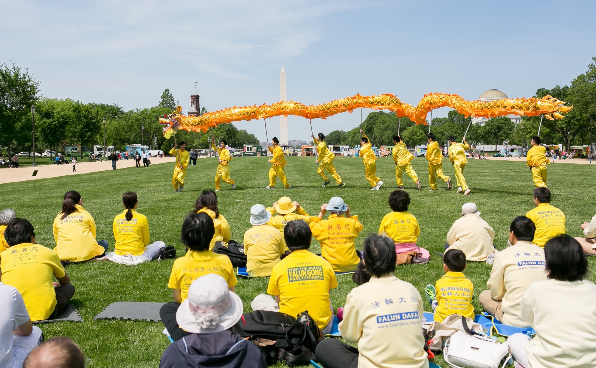 法轮功学员在华府庆祝法轮大法日,表演腰鼓、舞龙,欢乐祥和