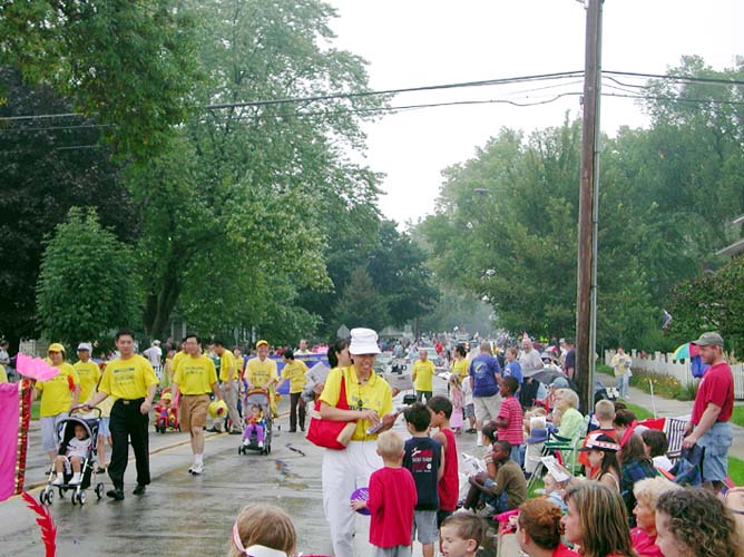 法轮功学员参加芝加哥Naperville的劳动节游行展现大法的美好图为沿途的观众索取资料2007-9-3