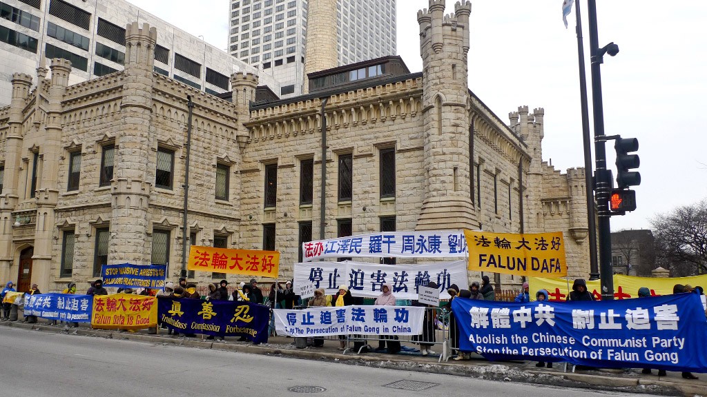 芝加哥法轮功学员在中领馆前炼功请愿 呼吁制止江泽民一伙在香港对法轮功学员的政治迫害