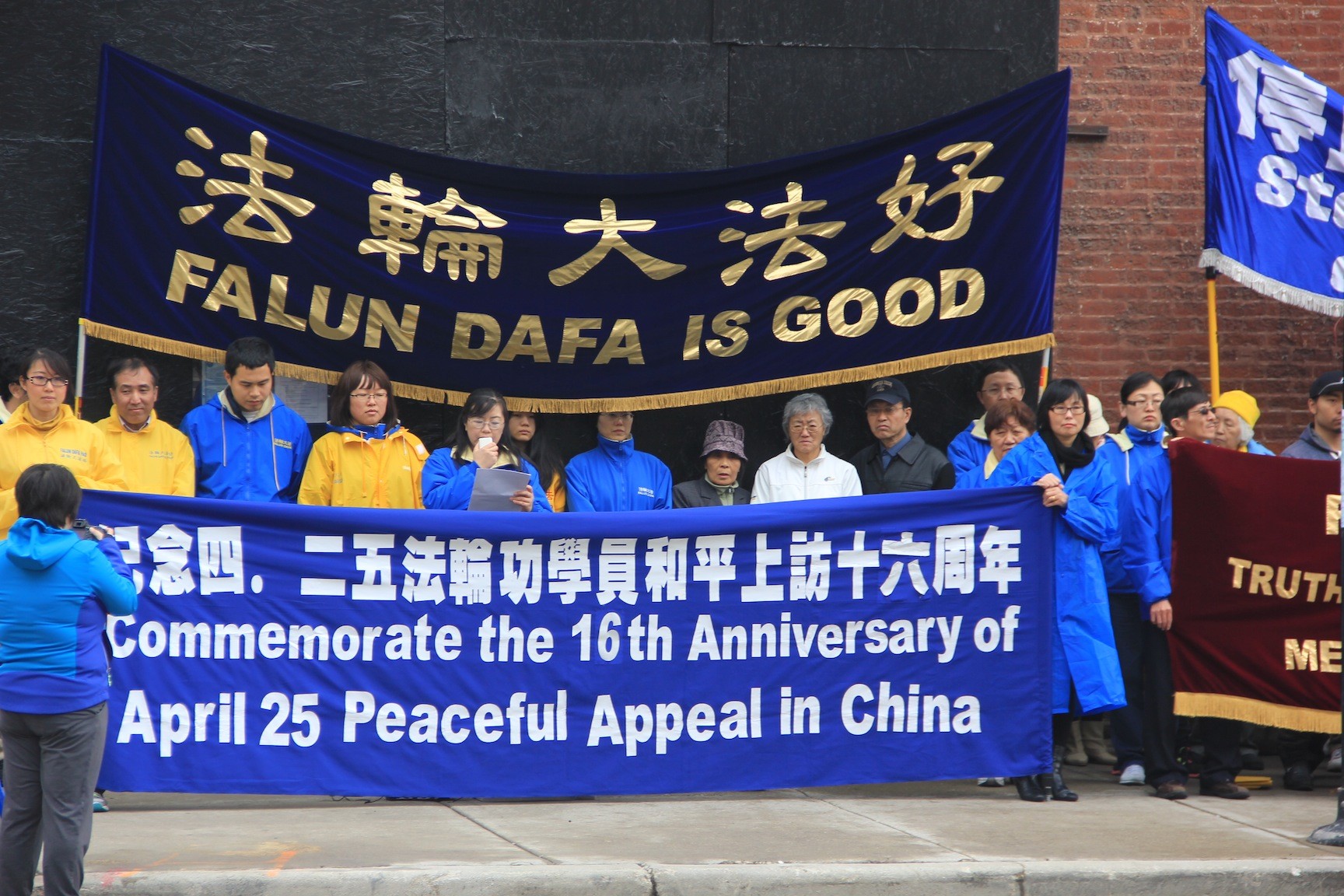 法轮功学员在集会现场举展板和横幅