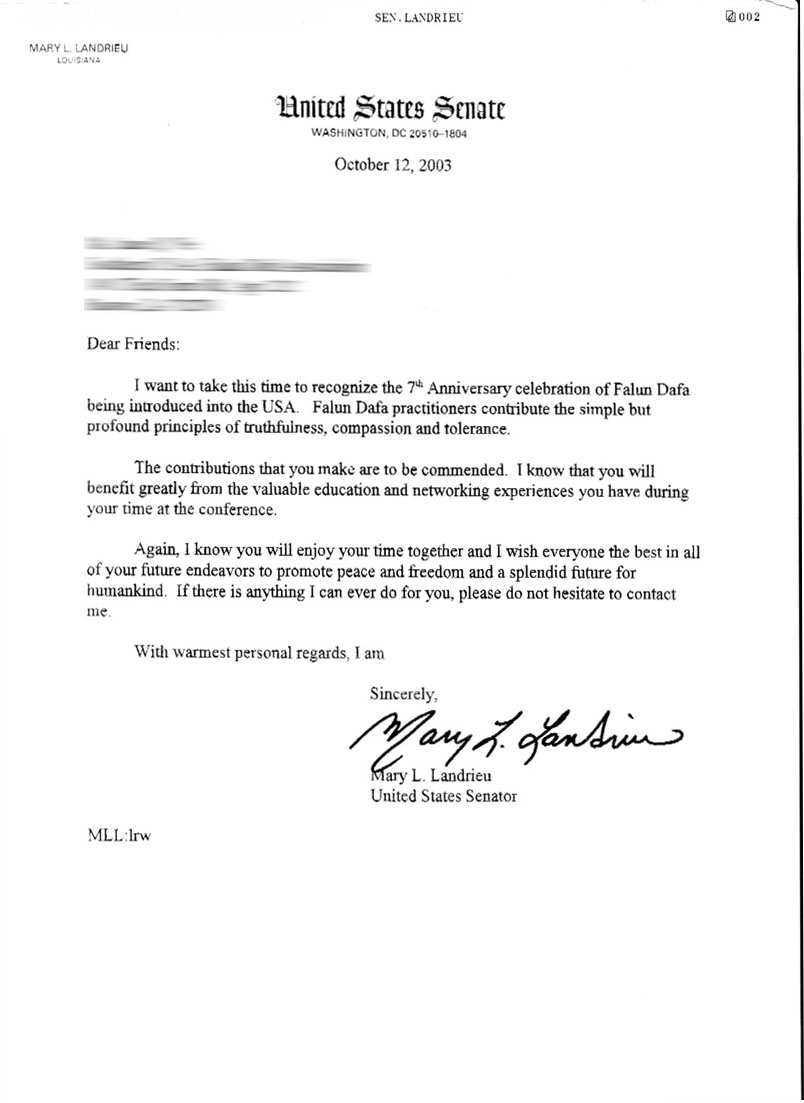 美国路易斯安那州参议员写信祝贺法轮大法北美洪传7周年
