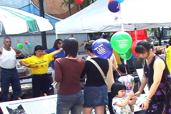 法轮功学员在波士顿中国城安详而宁静地炼功,吸引民众看展板及主动拿真相资料