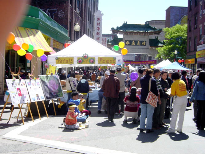 波士顿法轮功学员在哈佛广场参加五月节活动,洪法讲真相,教折纸莲花2006-5-7