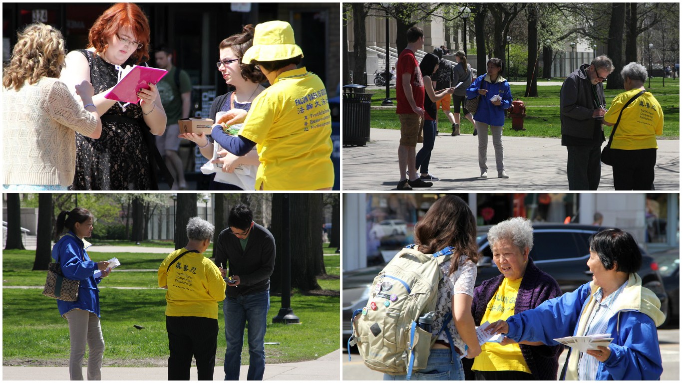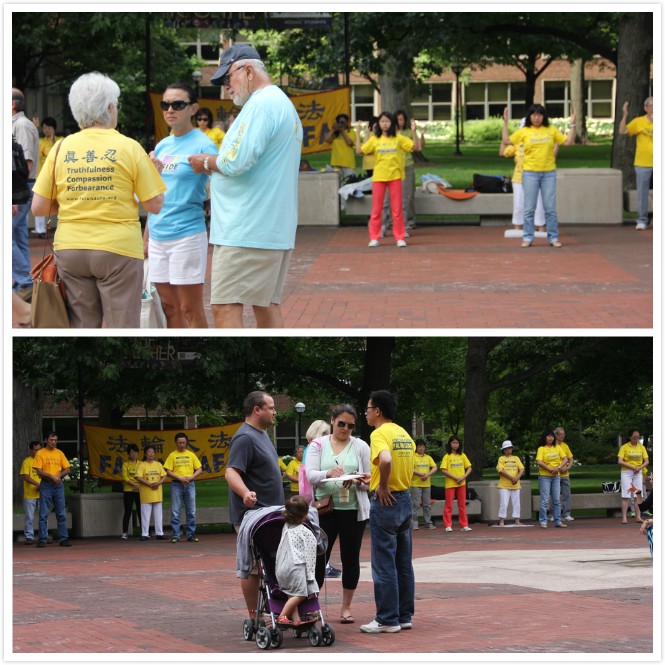法轮功学员在密西根大学校园里集体炼功,讲真相