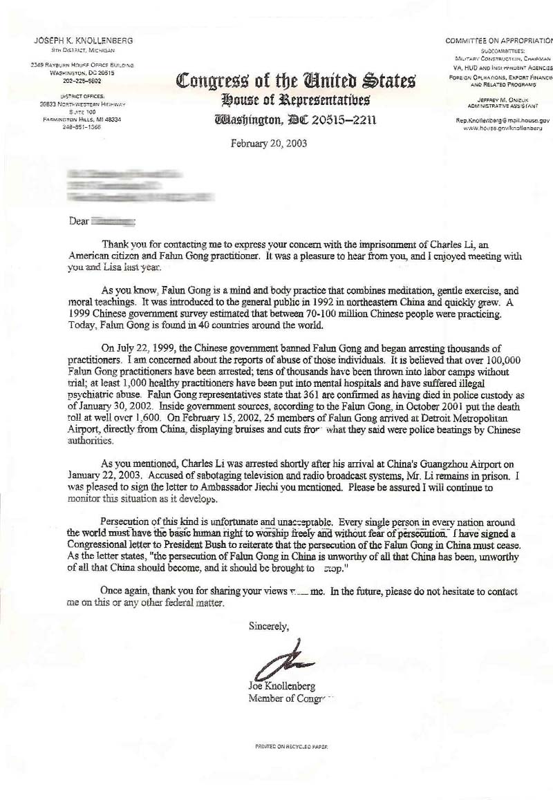 密西根州国会议员致信法轮功学员:"中国[江氏政府]对法轮功的迫害必须停止"