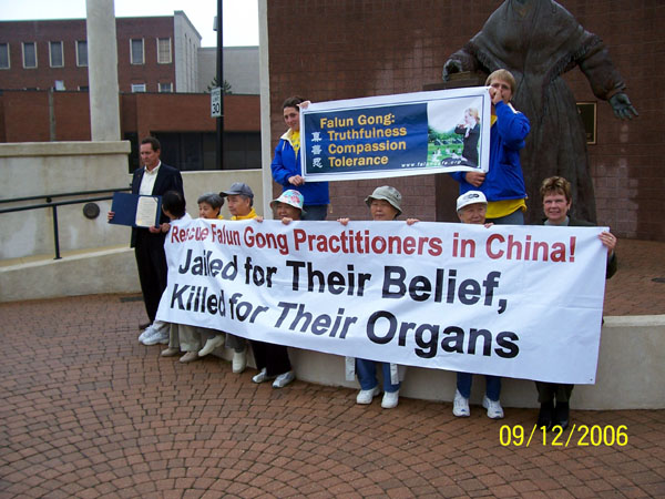 密西根学员举办汽车之旅呼吁制止中共活摘法轮功学员器官的暴行 图为巴特尔克里克市议会议员宣布市长给法轮功的褒奖后与学员合影2006-9-12