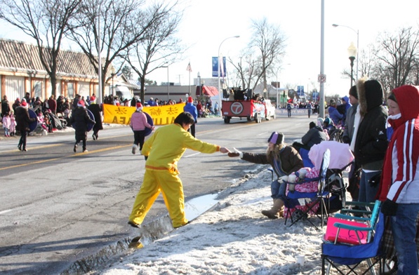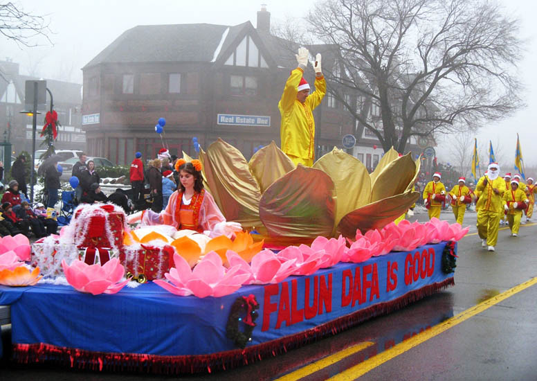 法轮功学员应邀参加密西根州罗彻斯特圣诞大游行,传递大法的福音和神韵晚会的信息2008-12-7
