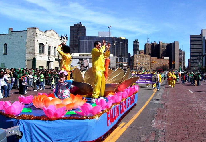 法轮功学员参加密西根州爱尔兰社区的圣•派翠克日游行图为法轮功队伍格外耀眼