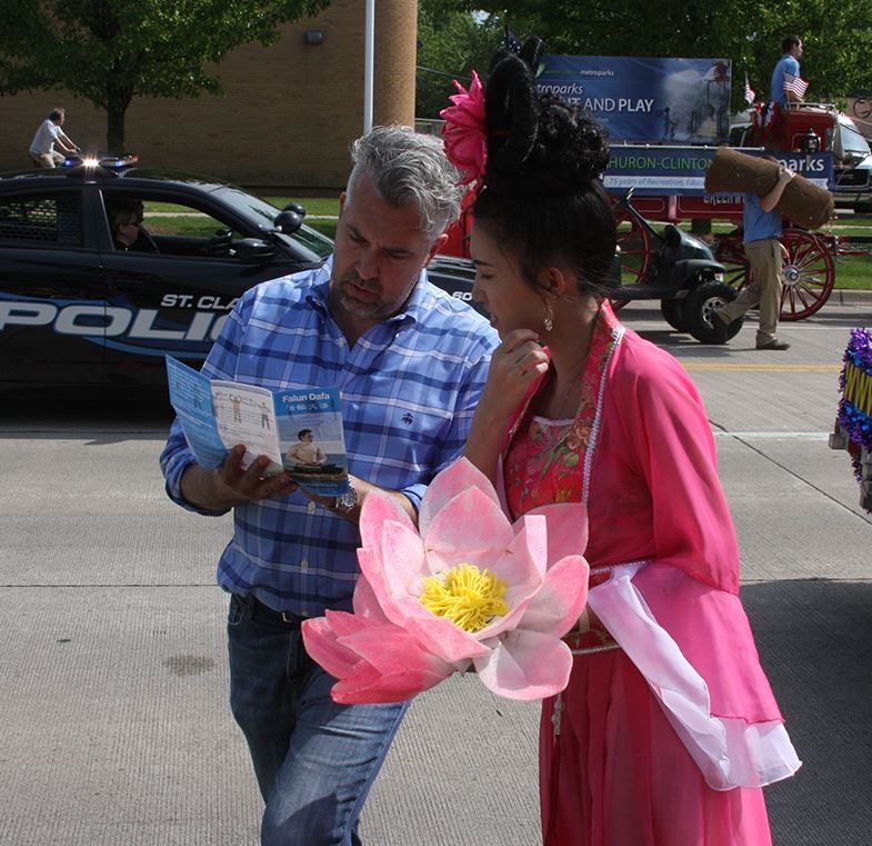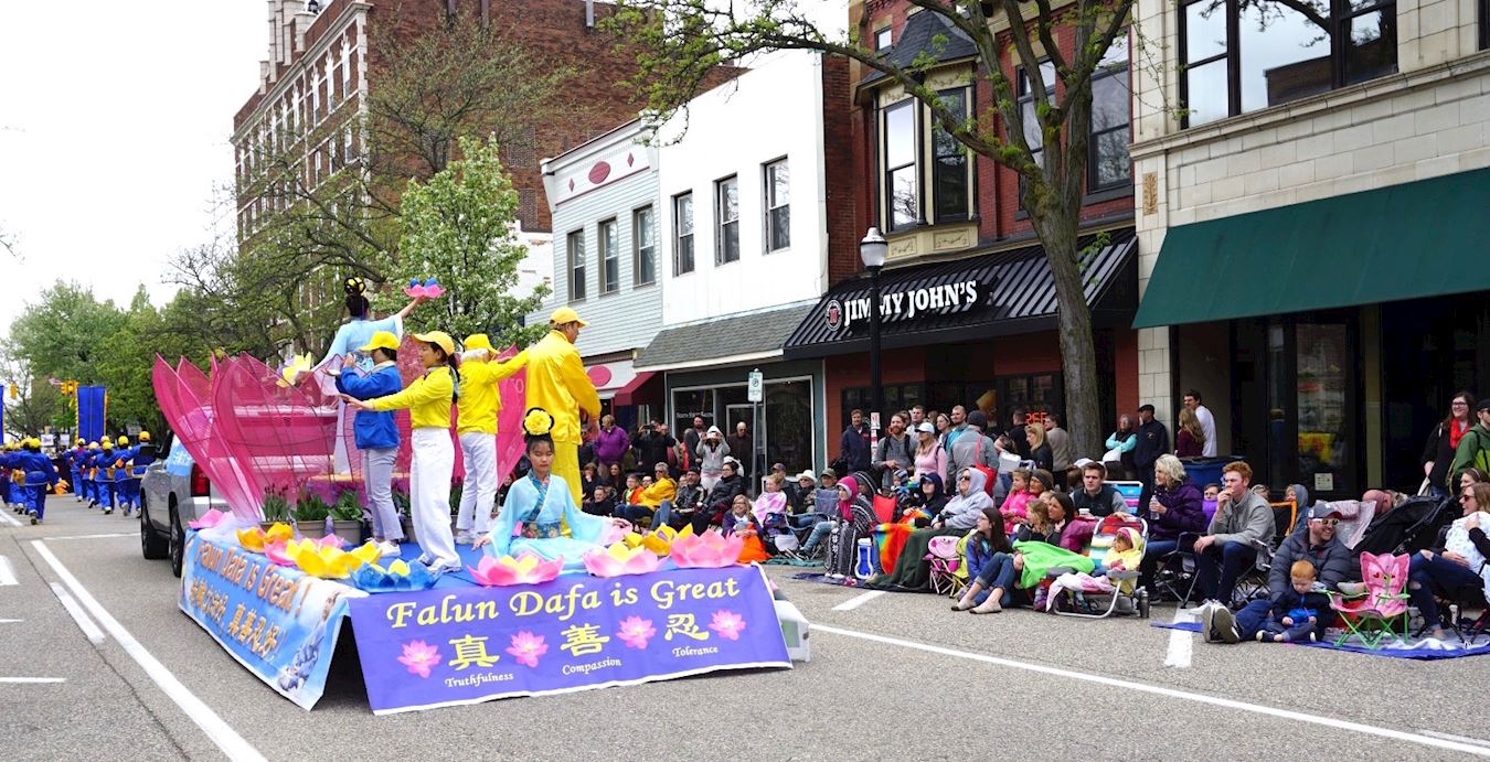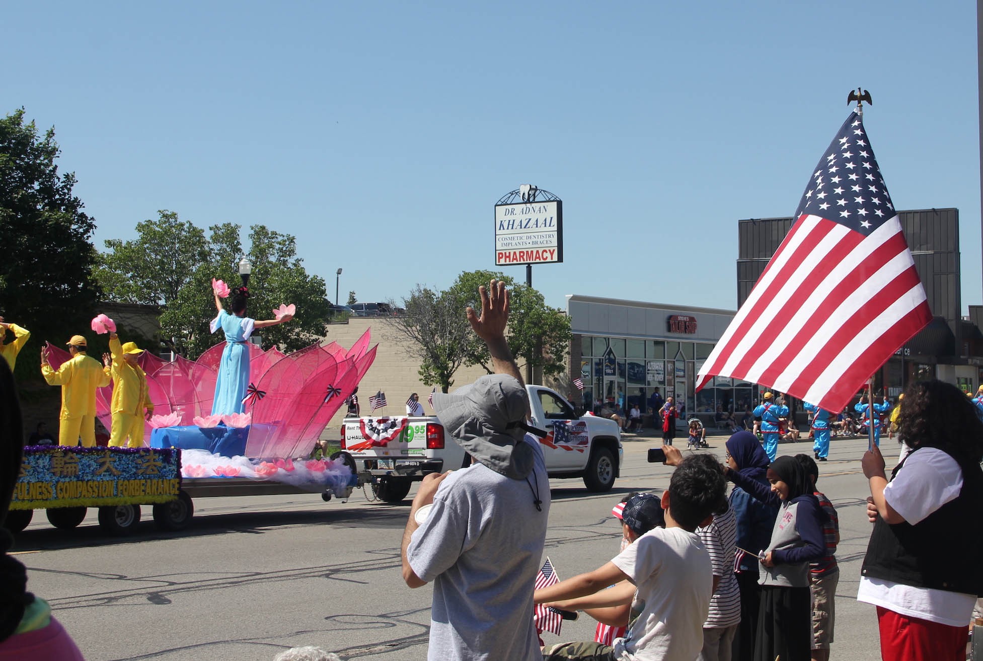 法轮功学员参加密歇根州康东市自由庆典大游行,将大法的美好呈现给民众