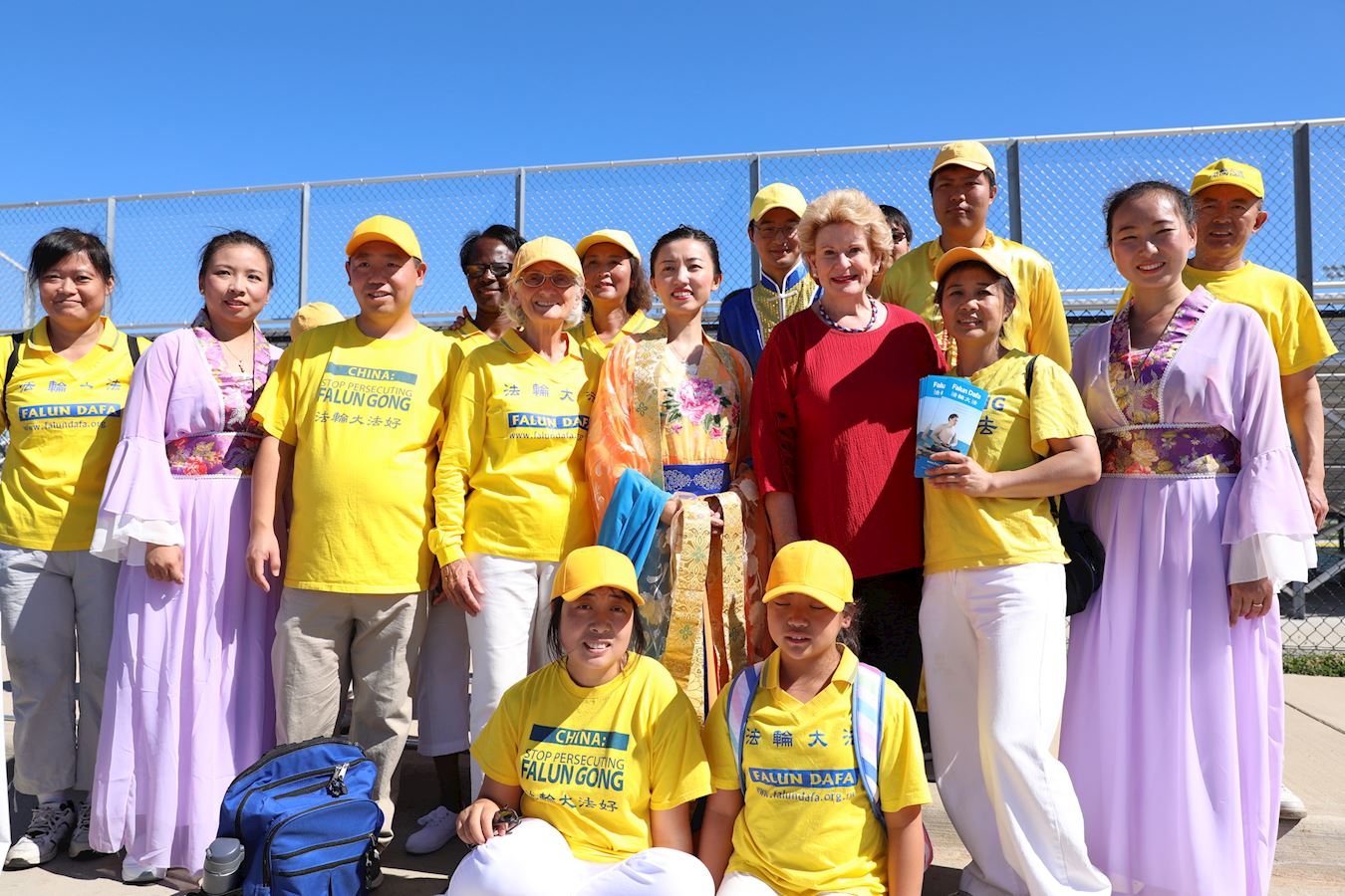 来自密西根州的美国联邦参议员戴碧-斯泰比诺(左四)与她的立法助理道克-萨切尔先生(右一)与密西根法轮功学员合影。黄布上写有"释放李祥春"及民众签名。