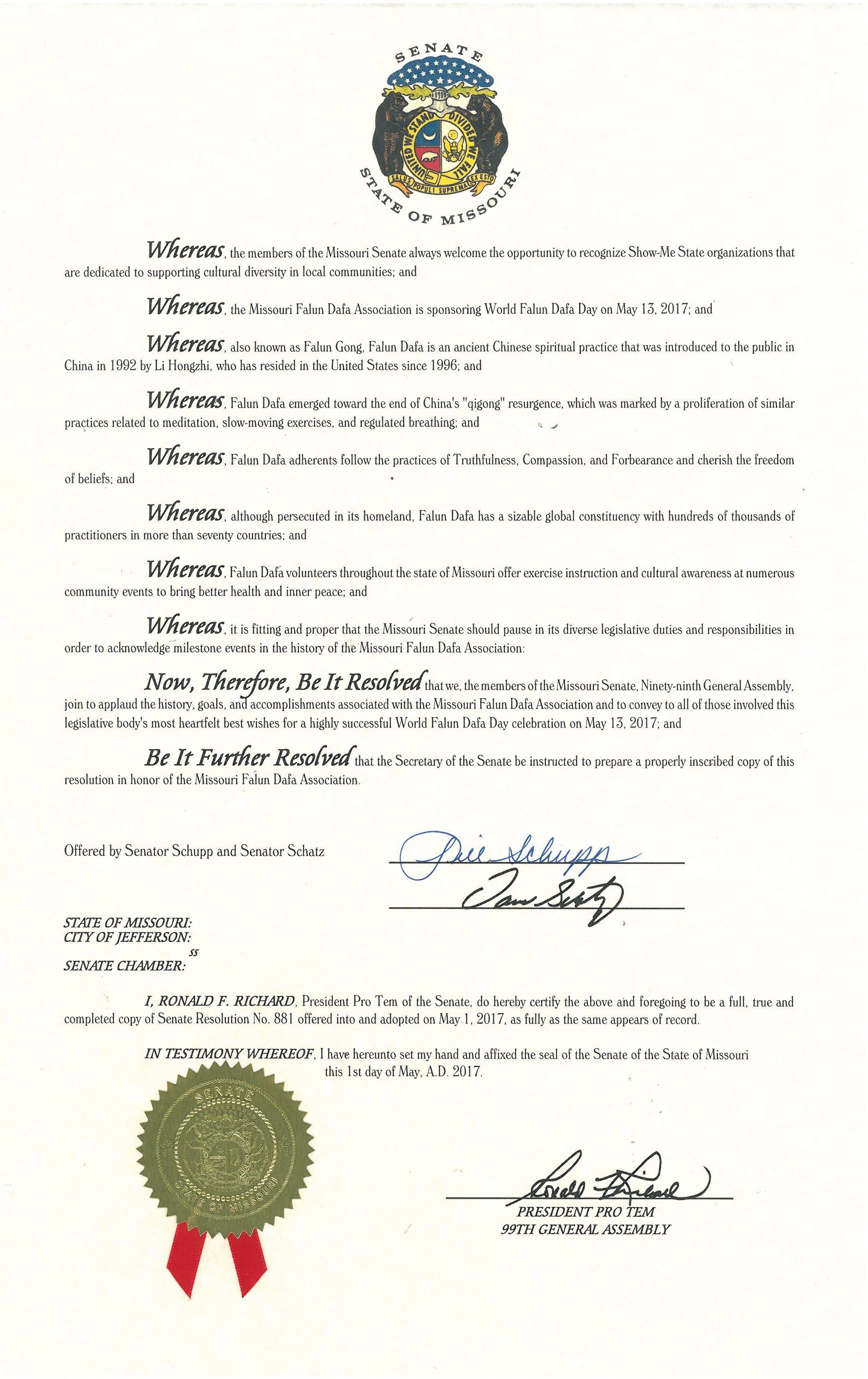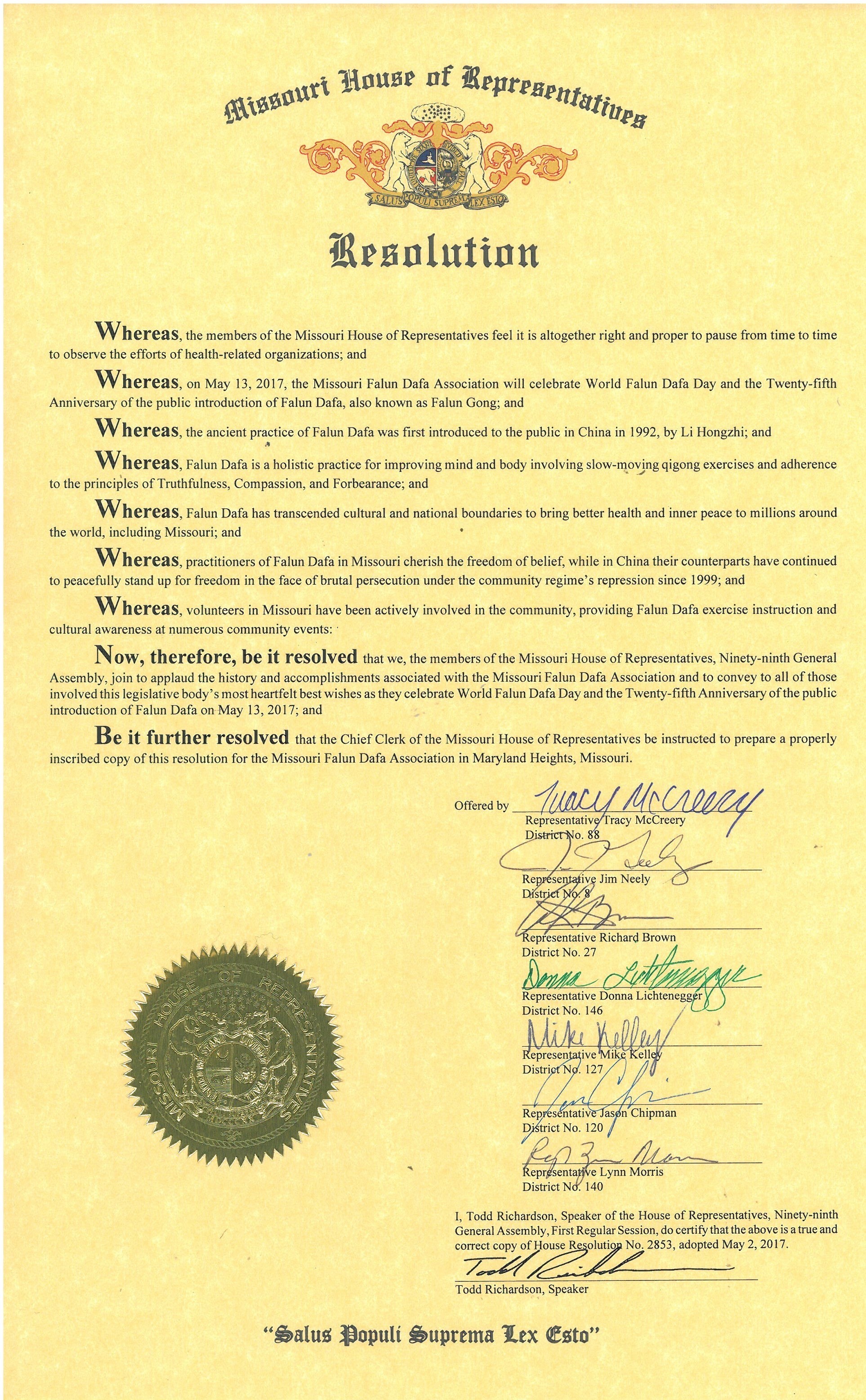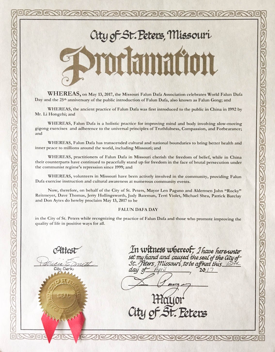 美国密苏里州奥法伦市褒奖法轮大法,市议会为法轮功学员颁发褒奖