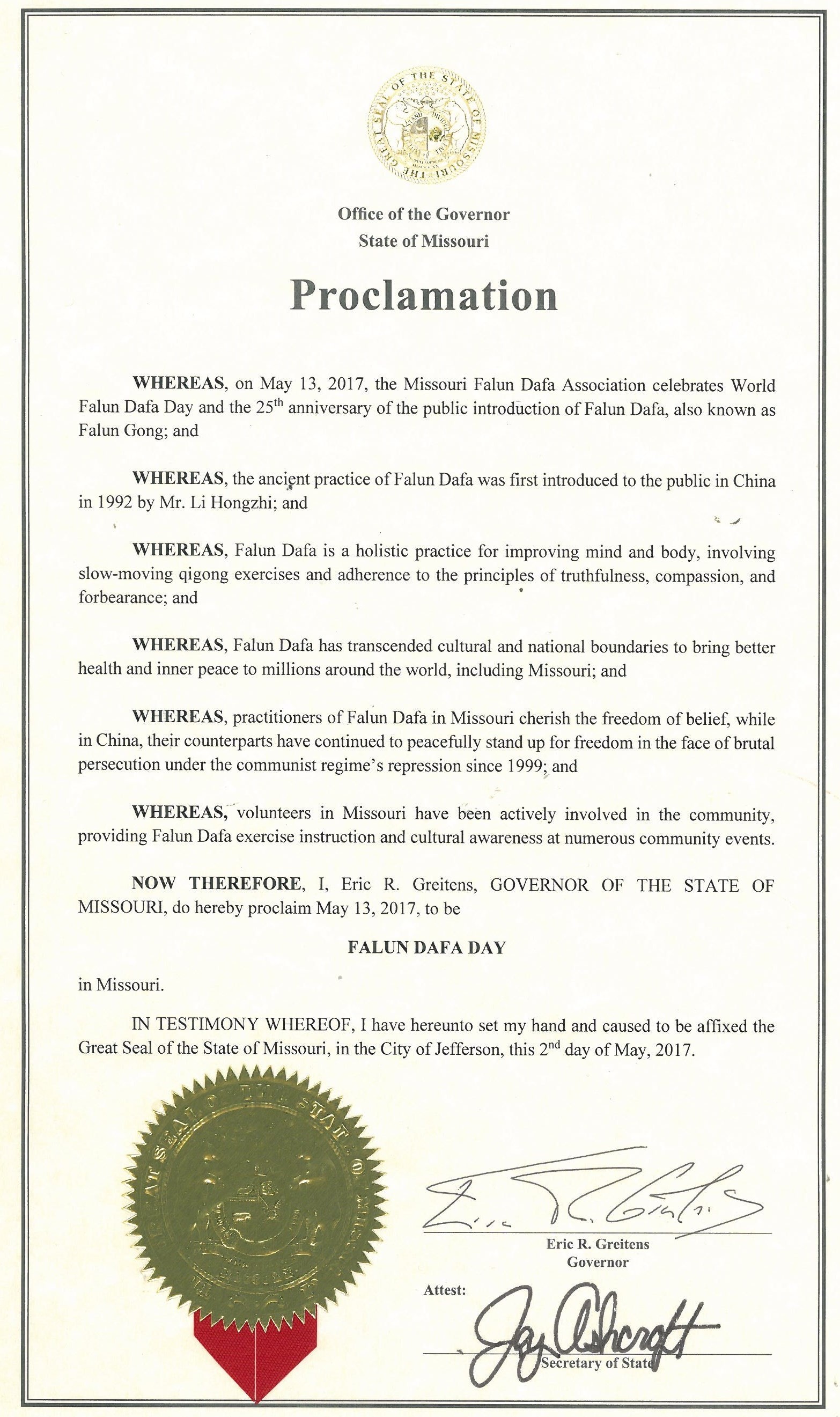 美国密苏里州州府杰斐逊城宣布法轮大法日