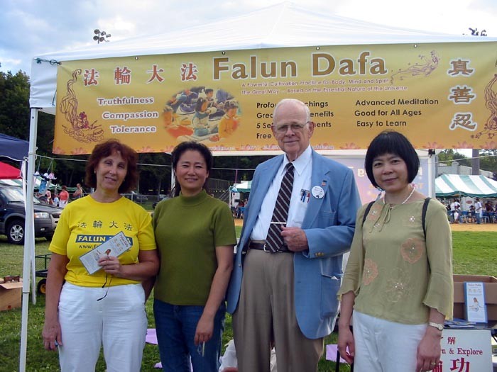 2001年新泽西州法轮功学员参加普兰斯堡市大型社区活动-普兰斯堡市市长Peter A. Canter及国会议员Rush Holt与学员们亲切交谈并感谢法轮大法给社区带来的安定和美好