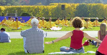 法轮功学员自由钟前吁止迫害 - 游人被法轮功学员的集体炼功所吸引