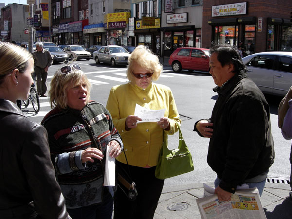费城学员在自由钟广场抗议中共活体摘取法轮功学员器官的暴行 图为行人在了解真相2006-4-29