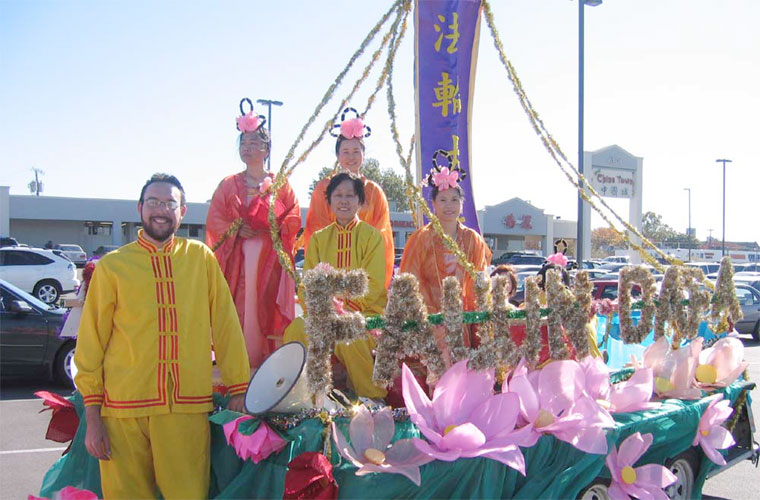 美国学员参加峡谷湖年度圣诞游行 图为在洪法花车上展示功法