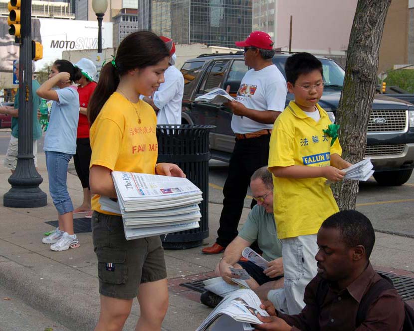 纪念法轮功创始人李洪志老师1996年10月12日来德州休斯顿讲法七周年纪念日的系列活动--游行中发放真相资料