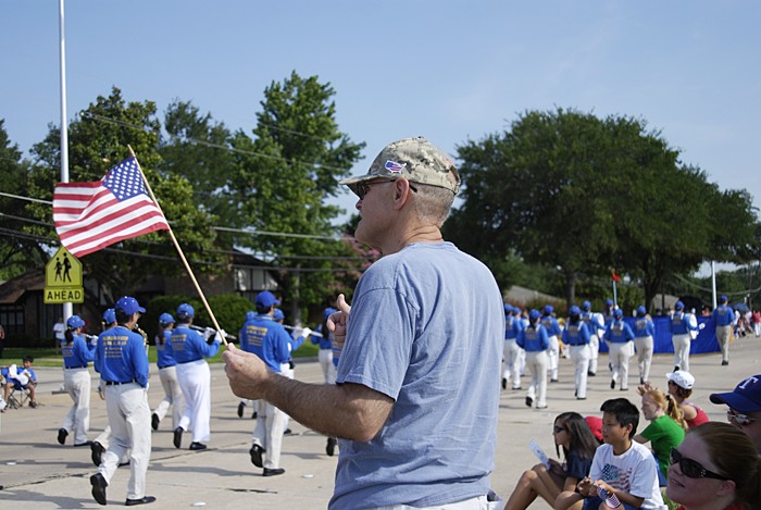 达拉斯法轮功学员参加德州最大的独立日游行 图为法轮功学员的队伍吸引了媒体