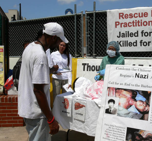 休士顿法轮功学员市中心揭露中共集中营罪行 图为市民了解集中营真相2006-4-8