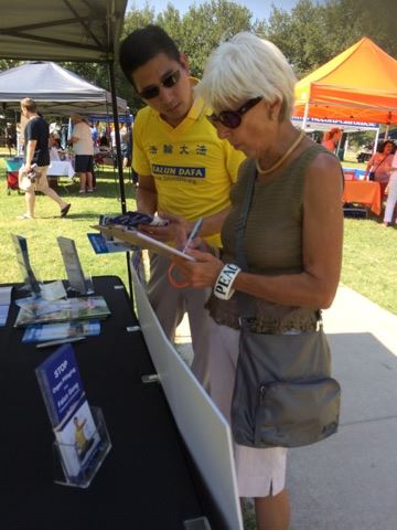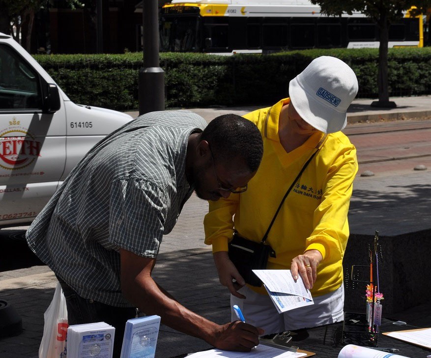 法轮功学员在达拉斯市中心纪念"四·二五"和平上访图为民众签名要求制止中共的罪行