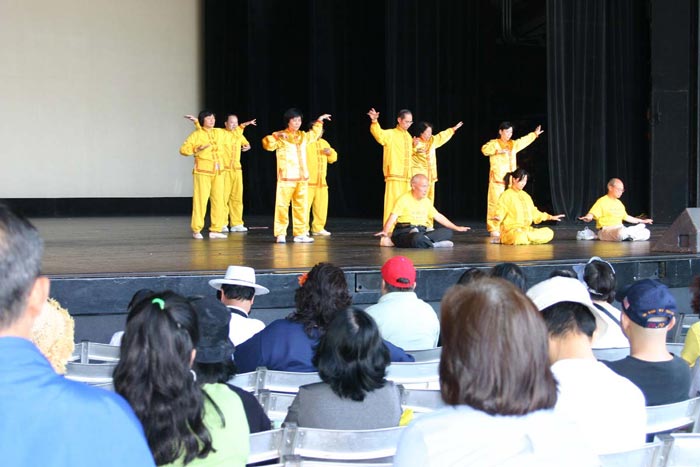 法轮功学员德州嘉伦市亚裔艺术节上洪法图为演示祥和、优美的五套功法2008-12-6