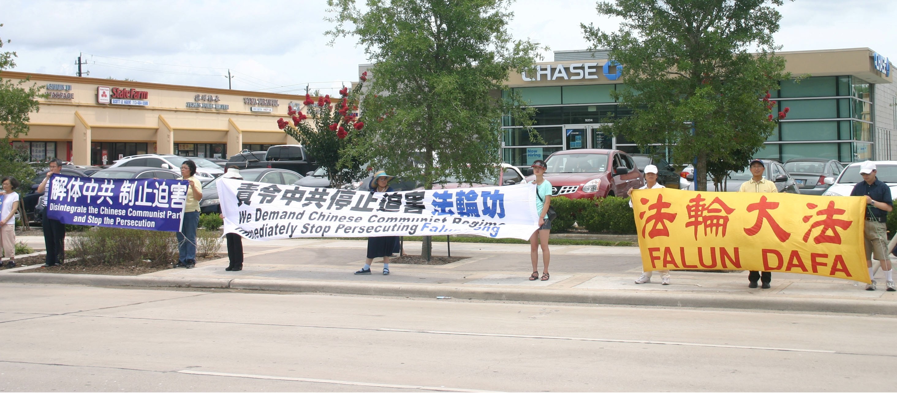 休士顿法轮功学员与全球同步连续三天在中领馆前和平请愿,揭露江泽民犯罪集团杀戮法轮功学员的罪行