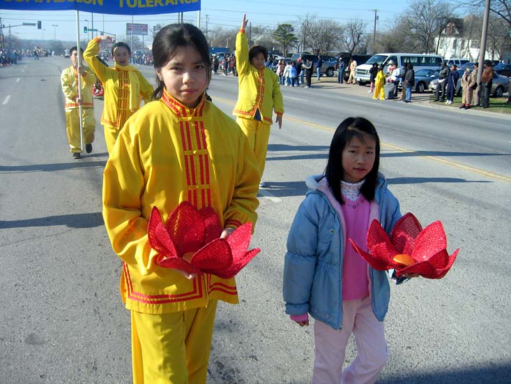 美国达拉斯法轮功学员参加马丁-路德-金日游行 图为游行队伍中的大法小弟子