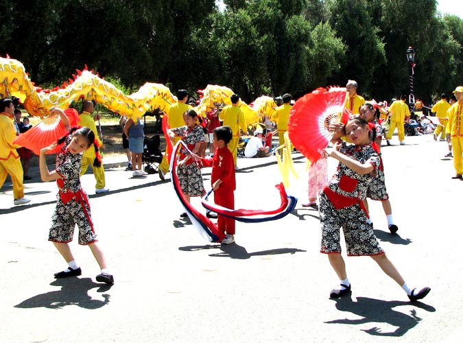 美国国庆游行 佛利蒙居民感谢学员带来真善忍 图为明慧学校小弟子表演的小飞天舞