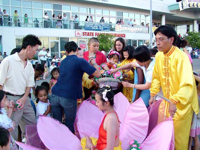 法轮功学员在西雅图与蒙若小城人民共庆百年大庆,图为学员送小莲花2006-8-23