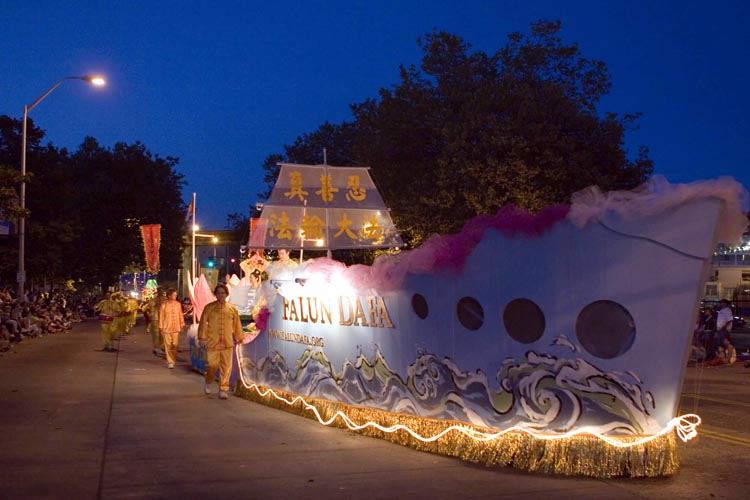 法轮功学员应邀参加西雅图"海洋节炬光游行"图为花车"法船"乘风破浪,浩荡航行。2007-7-28